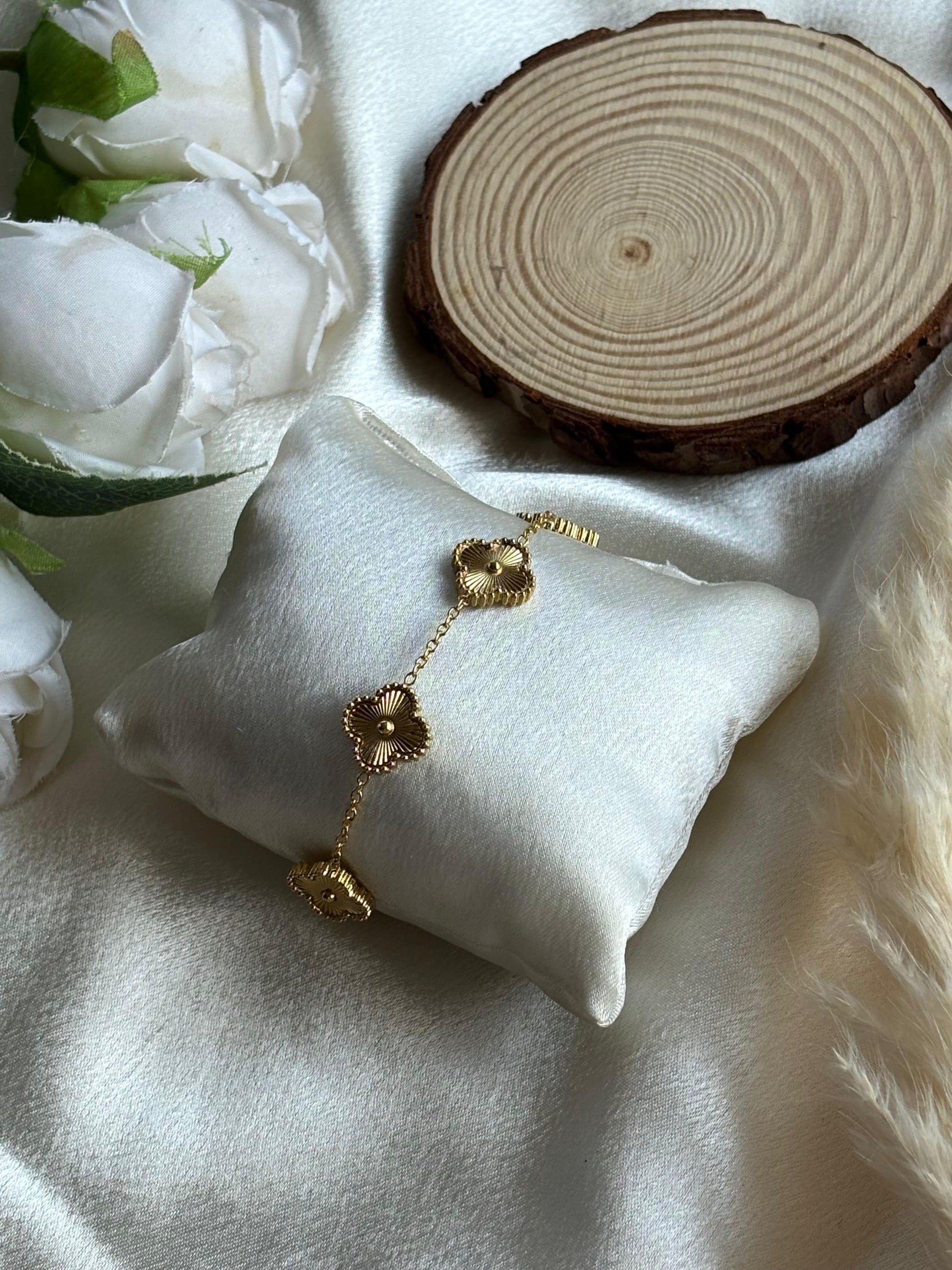 This elegant bracelet showcases three black clover charms on a gold-plated anti-tarnish chain, symbolizing luck and timeless beauty. Its refined design blends sophistication and charm, perfect for both everyday wear and special occasions. Lightweight and durable, it adds a graceful accent to any outfit.